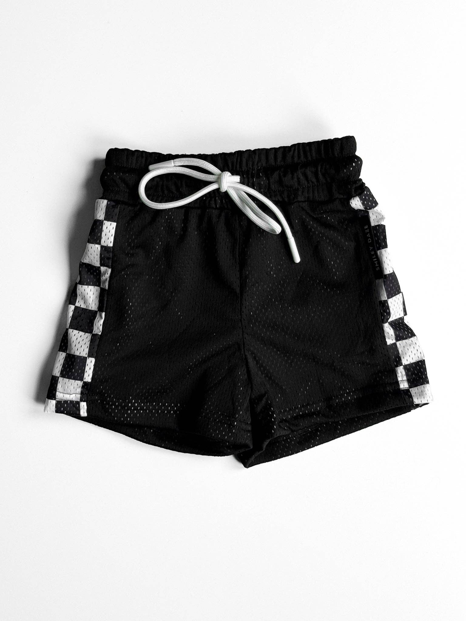Bold, breathable, and built for chaos — meet the Blackout Mesh Shorts. Designed with all-black mesh and signature black-and-white checkered side panels, these are the go-to shorts for kids who never stop moving. The elastic waistband and contrasting white drawstring make for an easy, adjustable fit with serious street style.