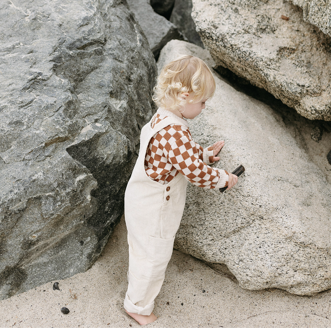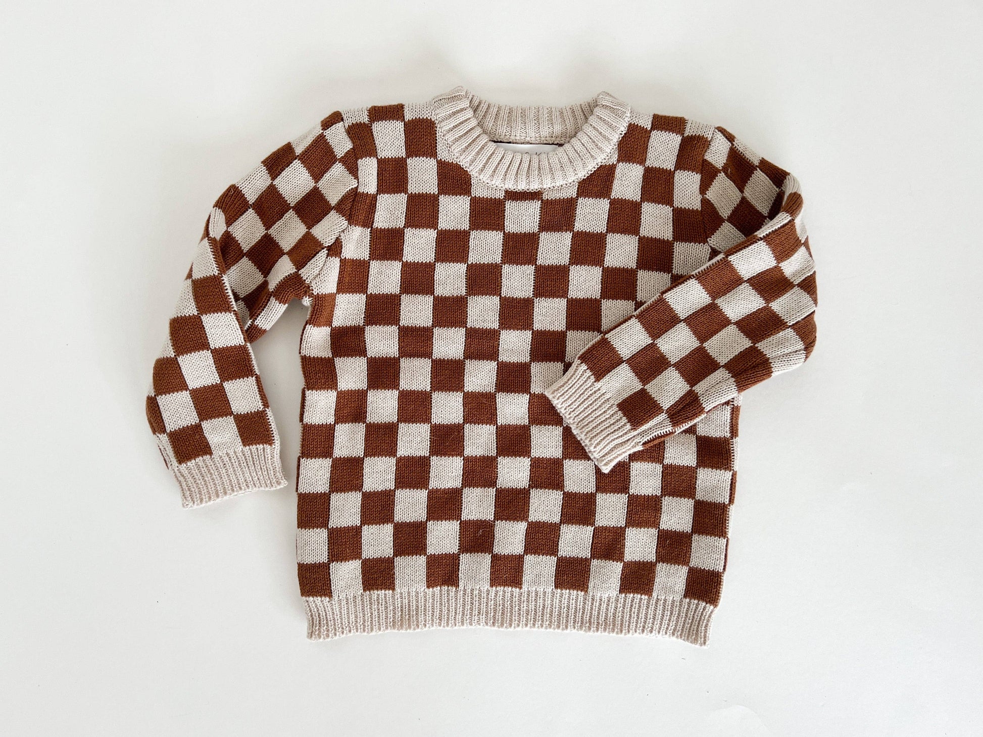 This sweater is thick, cozy and 100% cotton! This best selling Checkered Knit Sweater features a darker rusty brown color. Pair with our matching Corduroy Overalls to complete the look!