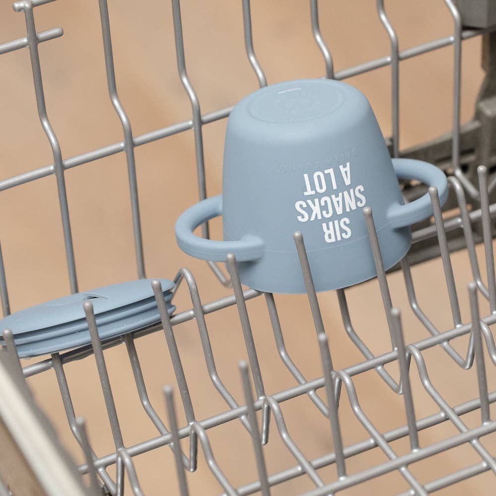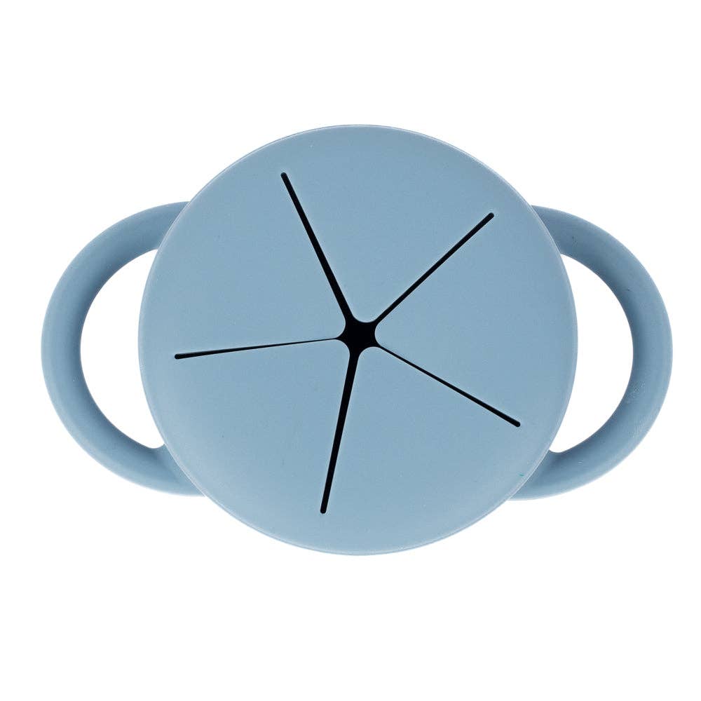 The Happy Snacker is a first-of-its-kind two-piece silicone snack cup with a mess-proof snap-tight lid and soft silicone opening so little hands can easily access food and prevent spills. Designed with easy-grip handles, it fits in car seats and stroller cup holders.